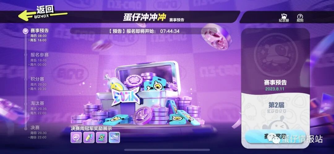 赛事分为四个阶段,分别为报名阶段、积分赛、淘汰赛、决赛,其他未报名参与的蛋仔可以参加竞猜,看看谁能取得最终的胜利,猜中的蛋仔玩家可以获得竞猜奖励。