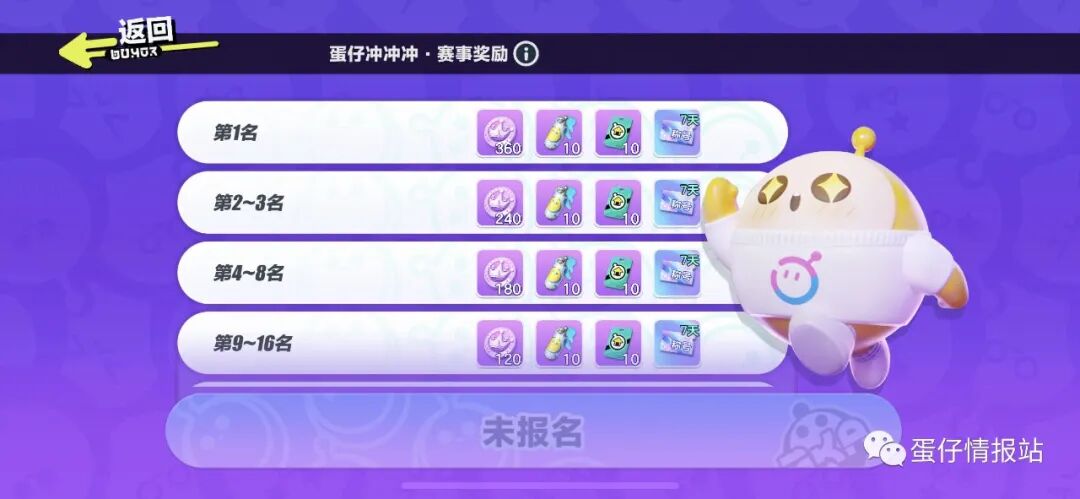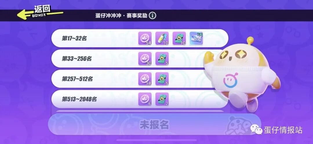 报名参加【蛋仔冲冲冲】的蛋仔玩家等级需要达到5级以上,段位需要达到鹅蛋及以上蛋位才能报名参赛,不满足要求的蛋仔是没办法参加报名的,所以不符合条件的蛋仔快多多打巅峰升段位吧~