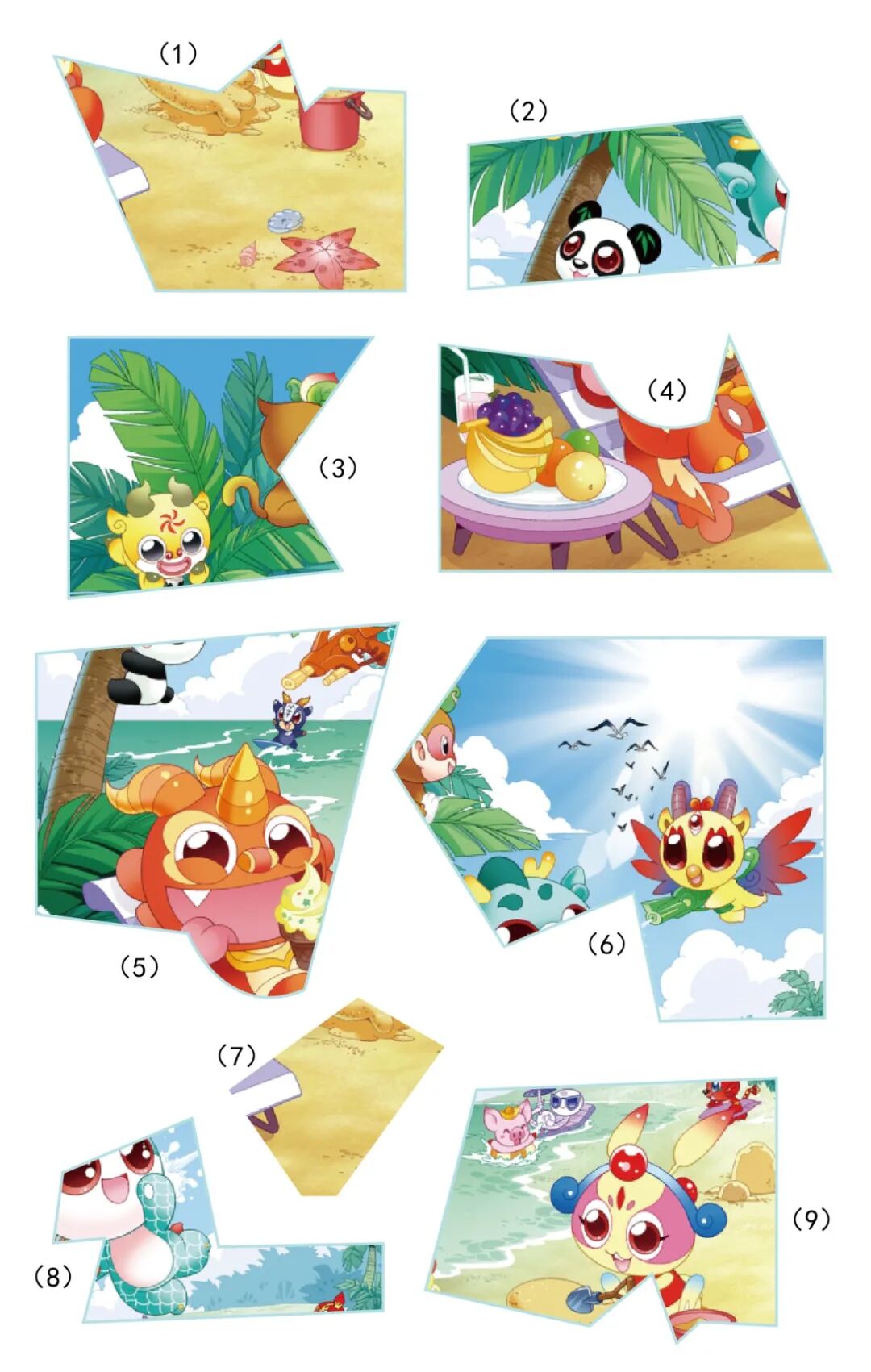 今天顶呱呱打算整理一下这些照片,但却发现其中有一张他们一起去沙滩的照片,不知怎么的,居然裂成了许多碎片。顶呱呱试着将这些碎片重新拼起来,但最终他却发现,居然出现了一块多余的碎片。