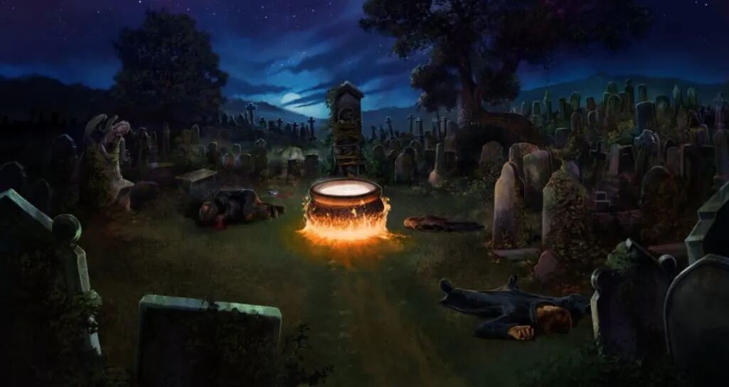 伏地魔在墓地用献祭的魔法,将血、肉和骨头铸成新的身体。