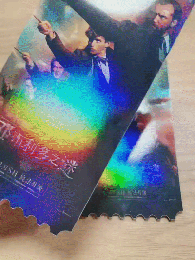 票根采用双面镭射设计(闪闪用小精灵魔法对“荧光闪烁”咒进行了升级改进,加入了票根制作过程中),在光下会呈现出多彩反光,与图中魔杖射出的一道道光束完美配合~