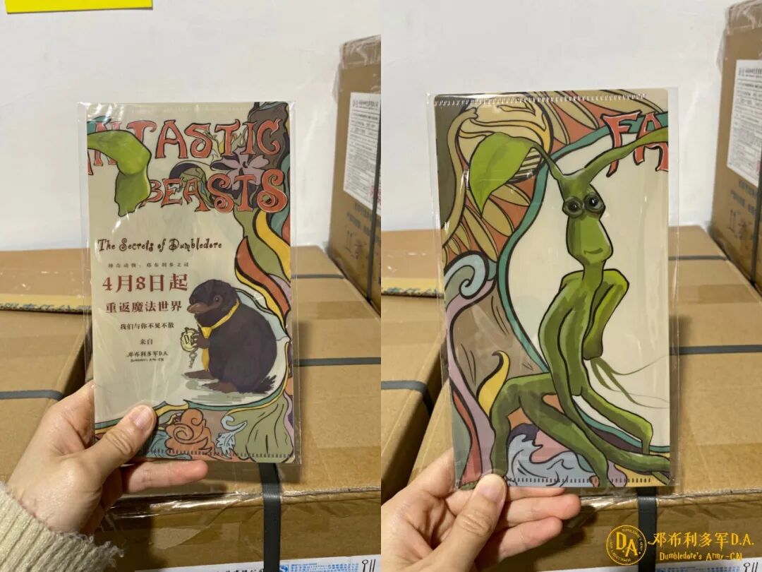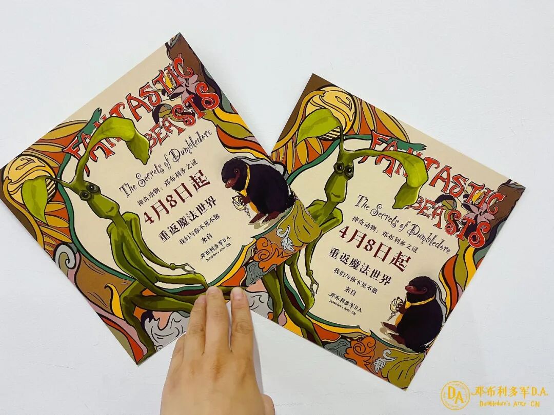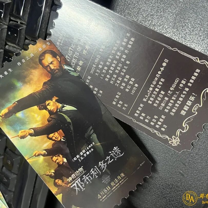 我们还为校友们准备了自制电影票根,希望可以帮大家弥补一下不能去影院观影的遗憾。取自对决版电影海报,GG和AD两大阵营剑拔弩张的大战氛围跃然卡上~背面则由D.A.的Cynthia结合《神奇动物:格林德沃之罪》剧本书中的边框和图案设计。