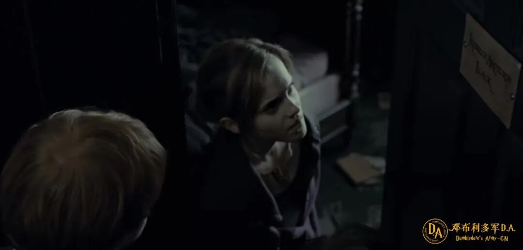 之后哈利跟着赫敏走到了楼梯平台,经过之前遗漏的门。他仔细端详门口的牌子发现这竟然是R.A.B.的房间,R.A.B.竟然是小天狼星的弟弟。
