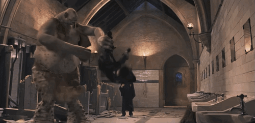 哈利、罗恩、赫敏三人和巨怪在女生盥洗室里的打斗是《魔法石》中一个决定性时刻。