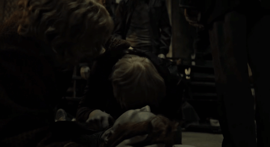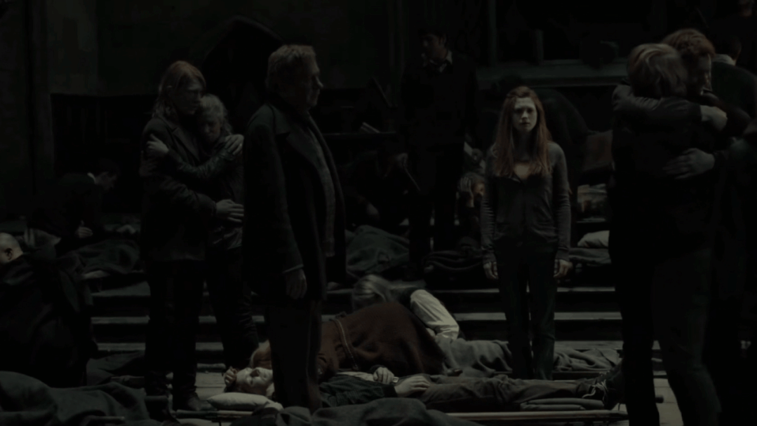 这一幕要细心观看,否则很容易错过。在《死亡圣器》哀悼逝者的一幕中,哈利在一旁,看着韦斯莱一家承受着失去弗雷德的巨大悲痛。