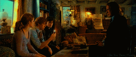 罗恩告诉哈利和赫敏,他不知怎么地(在熄灯器里面)听到了赫敏的声音。