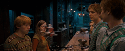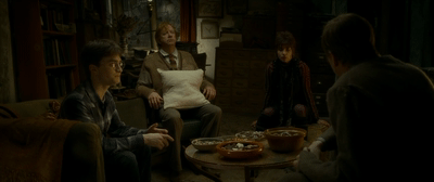 哈利和罗恩的舞伴都因为二者无心跳舞而离开了。罗恩对于赫敏和克鲁姆的关系进展十分不满和嫉妒,指责赫敏的“亲敌行为”并对克鲁姆的动机表示了怀疑,他俩大吵一架,不欢而散😭。