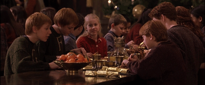 弗雷德和哈利拉开一个巫师圣诞爆竹🧨——拉扯时听起来像枪声,里面充满了神奇的魔法小玩意,还有真正的老鼠🐁。