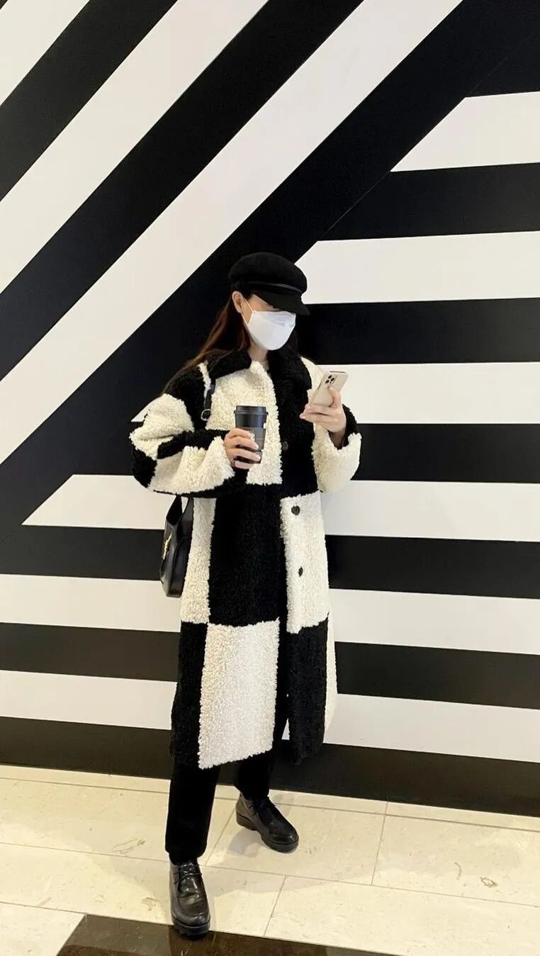 身着外套、帽子和长靴的秀贤高雅而复古,黑白格冲击着黑白条纹背景墙,似融入又似对比。