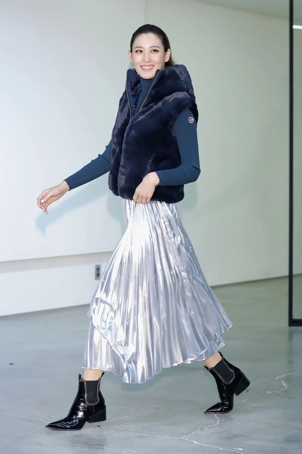 毛绒厚马甲、银色半裙和漆皮靴,简洁而时尚。