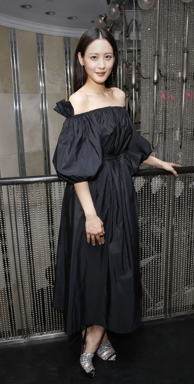 黑色泡泡袖长裙肥瘦恰到好处,顺滑的中分长发更凸显出锁骨和脖颈的精致线条。
