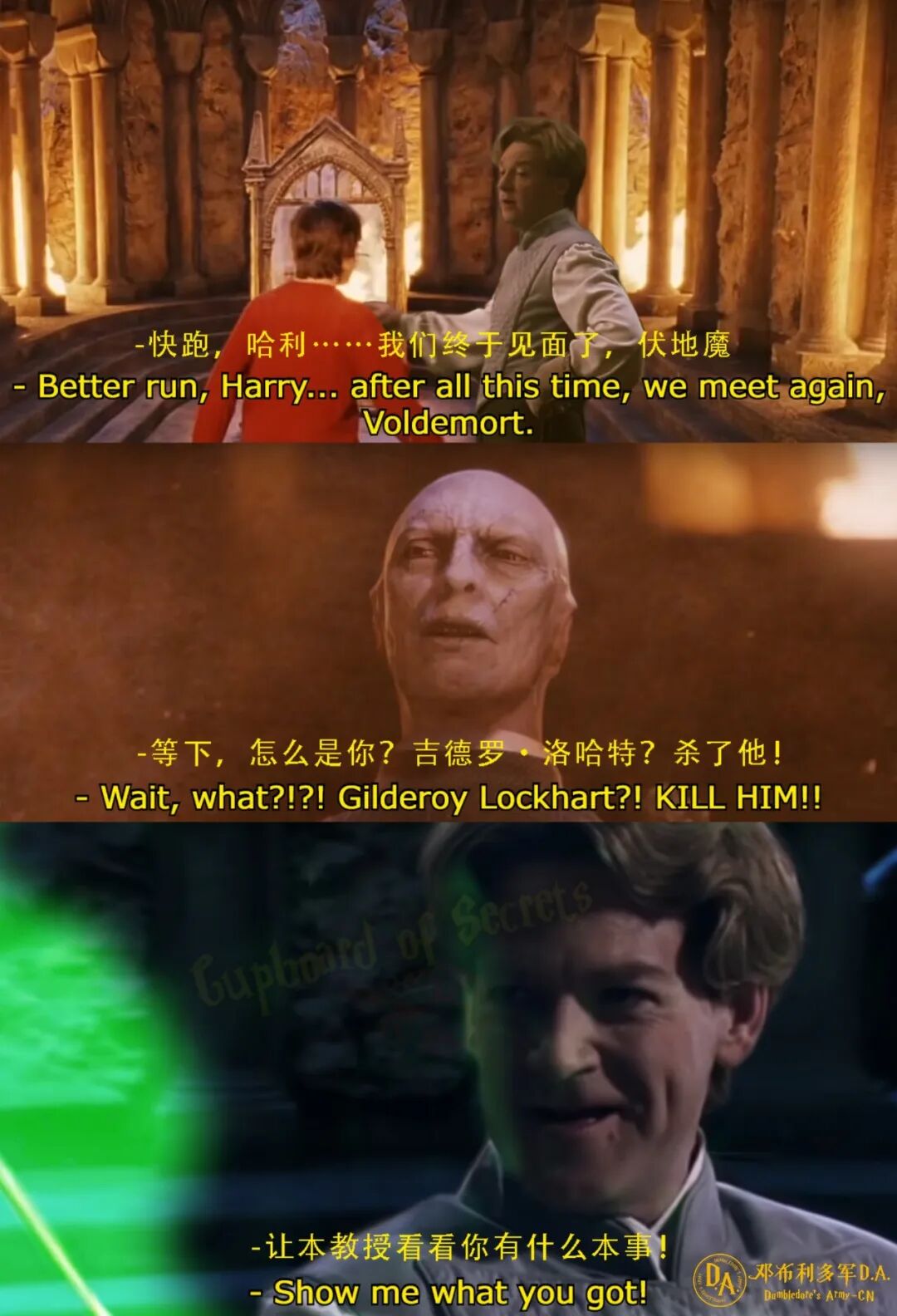 而后他成为了霍格沃茨黑魔法防御术的教授。大脑空空、徒有一副皮囊的洛哈特开始了一系列的“奇葩”操作——在教室放飞康沃尔郡小精灵、在魁地奇球场让哈利的骨头消失、在决斗赛场被斯内普重重击倒在地……有他的存在,我们总是不免为在场的人物捏一把汗,生怕他又做出什么“下饭”操作。而另一方面,他的那些让人捧腹的表现为危机重重、人心惶惶的第二学年增添了许多笑料,颇带一些诙谐的色彩。