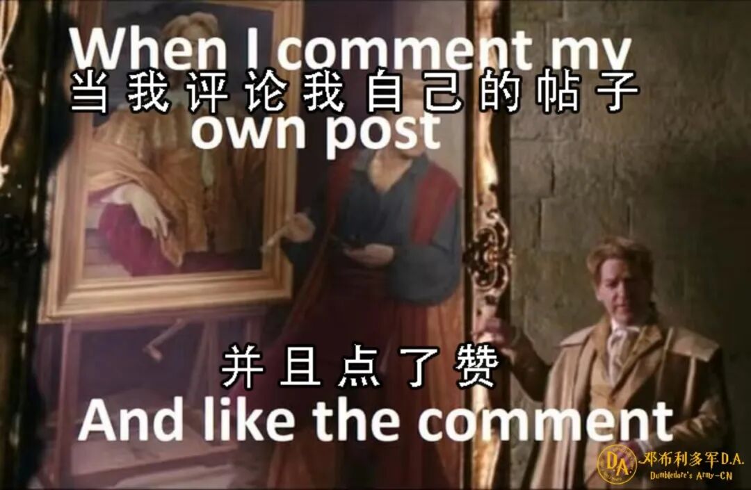 在《哈利·波特与密室》中,吉德罗·洛哈特非常重视他自己和他的冒险经历,他用他出的书来告诉学生一些关键事件。这个表情包表达的是洛哈特的行为和如今社交媒体之间的一些相似之处,他这种自恋态度和那些喜欢转评赞自己发的贴子的人简直一模一样。