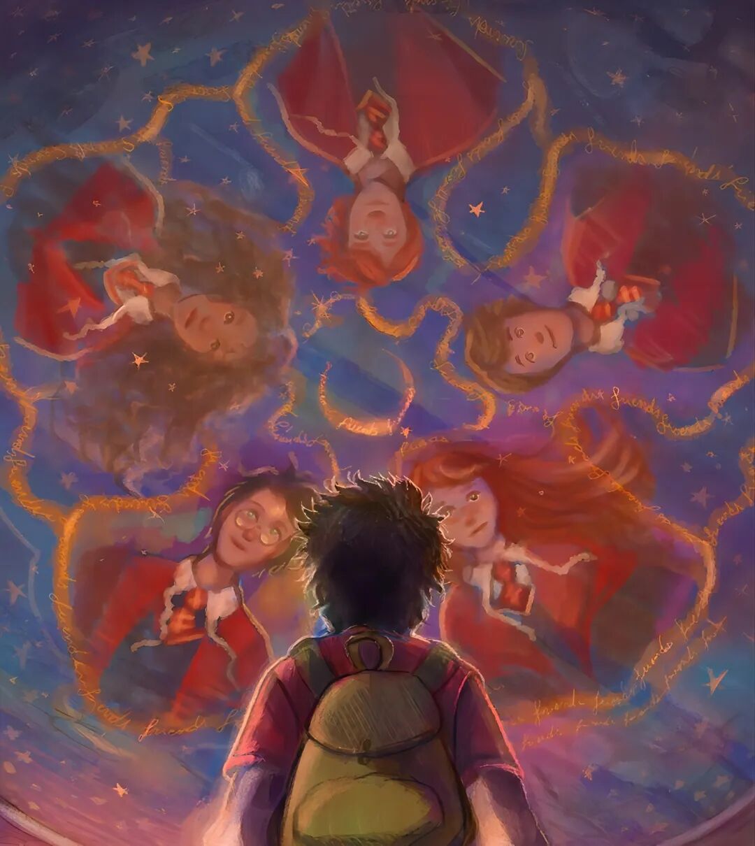 在《哈利·波特与死亡圣器》中,哈利在参观卢娜的房间时,他在天花板上看到了自己、罗恩、赫敏、金妮和纳威的画像。