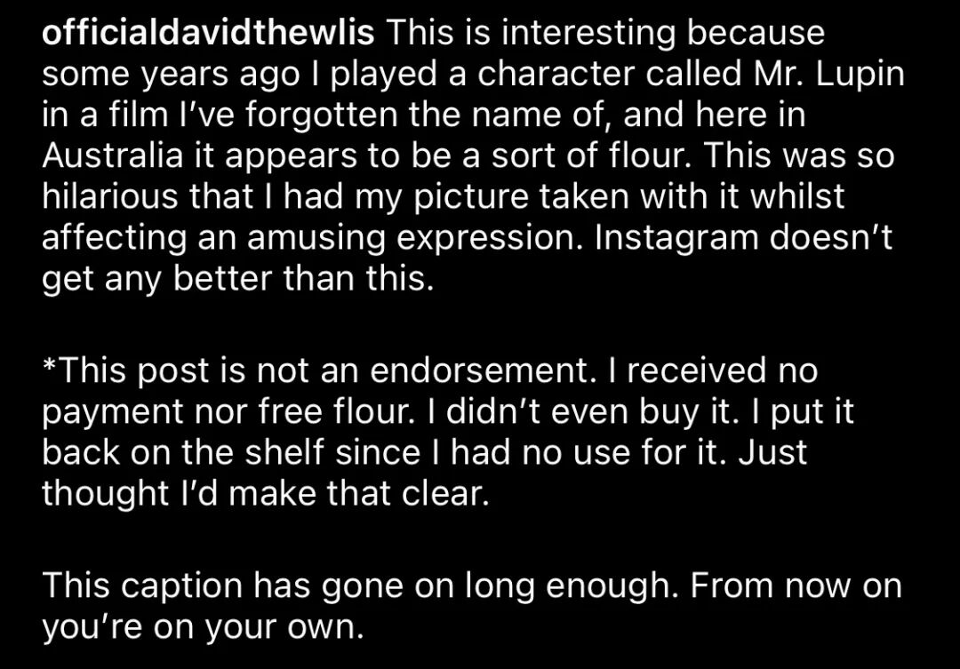 甚至会在超市兴致勃勃地与一袋“卢平粉”(Lupin Flour, 羽扇豆粉) 合影,以纪念自己多年前在一部“记不清名字的电影”里扮演过的一位“卢平先生”。