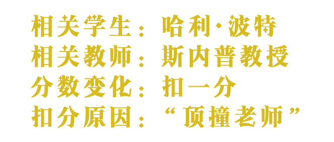 这时突然响起一阵摸索羽毛笔和羊皮纸的沙沙声。在一片嘈杂声中斯内普说:“波特,由于你顶撞老师,格兰芬多会为此被扣掉一分。”