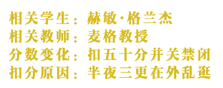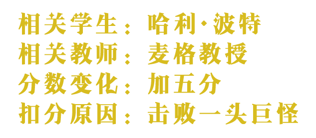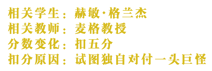“格兰杰小姐,因为这件事,格兰芬多要被扣去五分,”麦格教授说,“我对你感到很失望。如果你一点儿也没有受伤,最好赶紧回格兰芬多城堡去。学生们都在自己的学院里享用万圣节晚宴呢。”