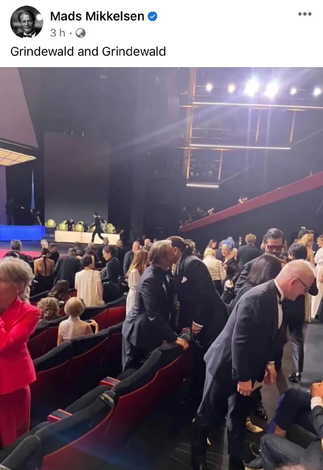 麦叔还特地发了脸书并配文“Grindewald and Grindewald”(请原谅英文不好的丹麦大叔,正确书写为Grindelwald。但还是让我们掌声欢迎他为我们创造的“中西合璧风”新角色——格林“de”沃)。期待他们二人能互飙演技,合作一部大片!(导演赶紧递本子!)