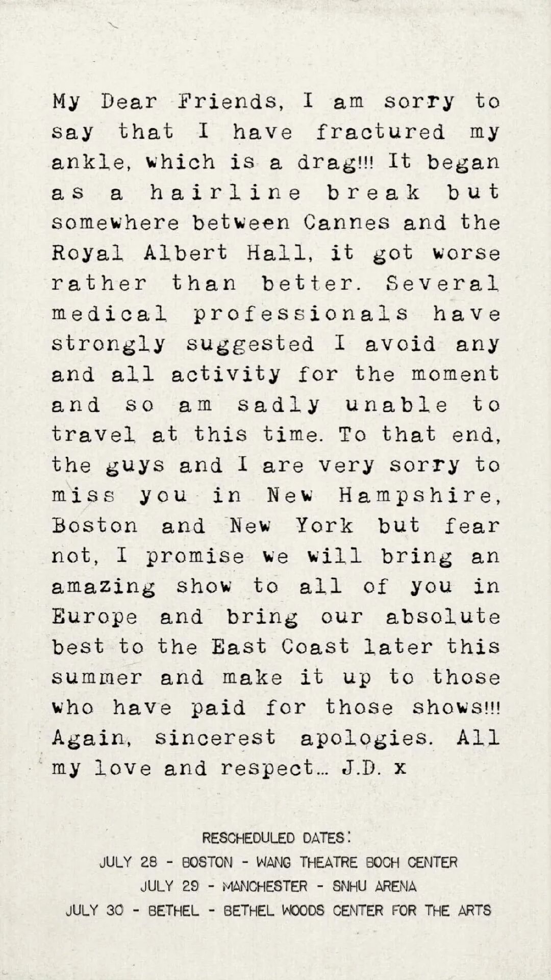 除演员之外,他还有另一重身份——“好莱坞吸血鬼”乐队的乐手,今年的戛纳电影节结束之后,他们也开始了新一年的巡演。不过5.29日德普在ins上发了一则快拍声明,表示自己因为脚踝骨折而无法演出……