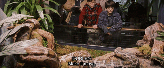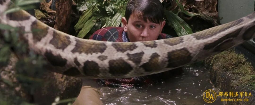 ,只好带着哈利一起去动物园。图源 | 电影《哈利·波特与魔法石》