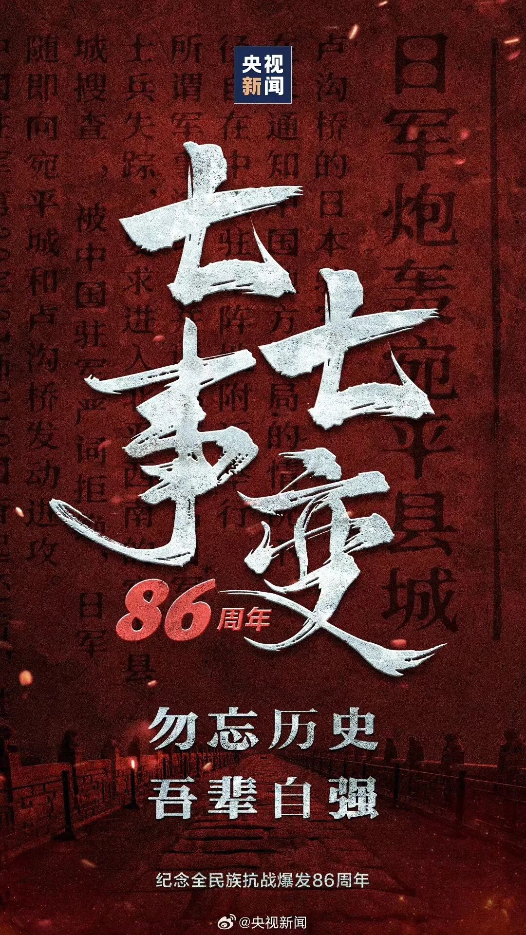 86年前的今天,1937年7月7日,震惊中外的七七事变爆发,这也标志着中华全民族抗日战争的开始。中华儿女奋勇抗敌,血染山河,才迎来如今的和平。向先辈致敬,铭记历史,吾辈自强!