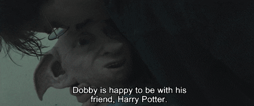 他躺在哈利的腿上呼吸微弱地说出最后几句遗言:“好漂亮的地方啊。多比跟朋友在一起。多比跟他的朋友哈利·波特在一起很快乐。”(书里只有“哈利……波特……”,译者注)