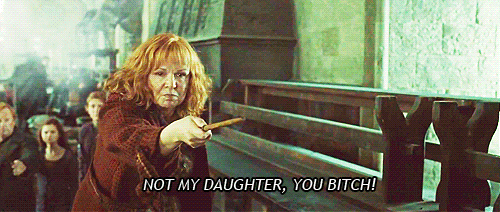 混战中,突然,贝拉特里克斯·莱斯特兰奇出现在金妮·韦斯莱面前,向她发射出杀戮咒,金妮躲过了。金妮的母亲莫丽·韦斯莱立即挡在她面前,保护着她,对贝拉说出了这句话。在这之后,她们进行了一场激烈的战斗,最终,莫丽大获全胜,贝拉被击毙。