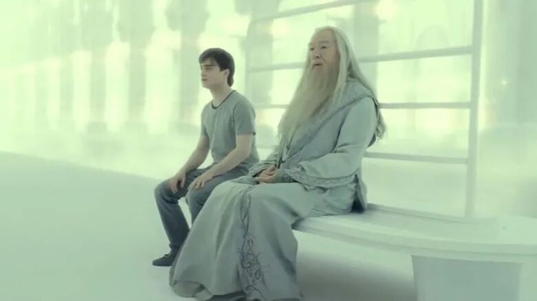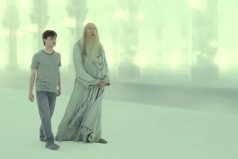 这个“梦幻世界”看起来很像伦敦的国王十字火车站,但全都是亮白色的,而且看不到火车。在这里,他很高兴地见到了阿不思·邓布利多。