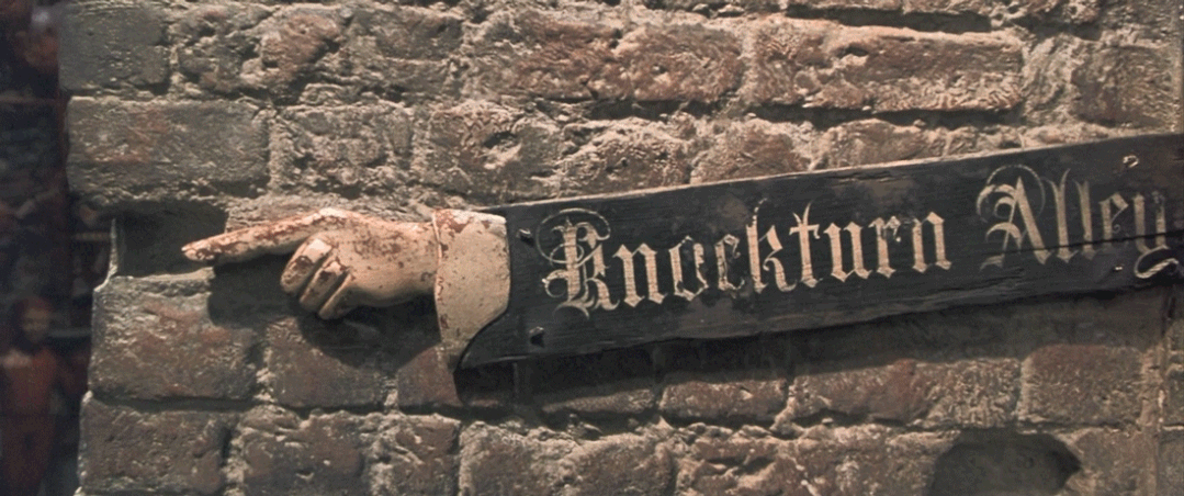 哈利发错了“对角巷”的发音,最终出现在翻倒巷的博金-博克商店中。碰巧看到了卢修斯带着马尔福在博金博克店里卖东西。等他们走后,哈利从商店里出来。海格刚好出现,把哈利带出了翻倒巷。