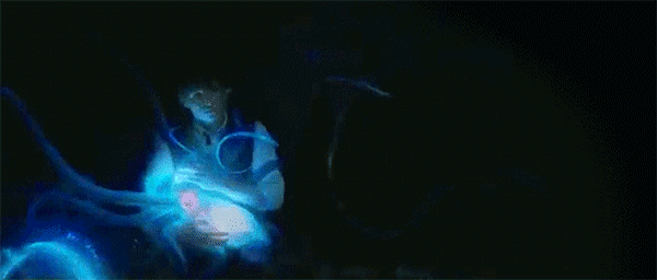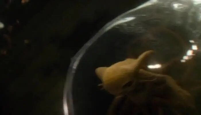 我们可以看到纽特用瓶子给一只幼年螨乌贼喂食,这是一种有着巨大触角、身体透明的神奇动物。