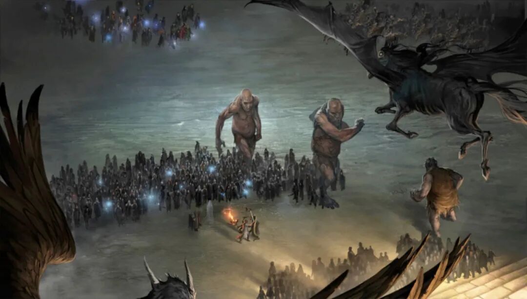 “他们听见远处学校界墙那儿传来了骚动,似乎千百个人浩浩荡荡地翻过视线外的围墙,高声呐喊着朝城堡冲来。”