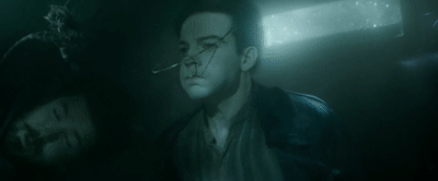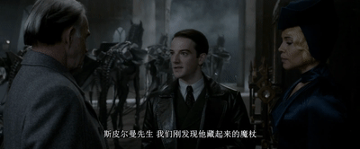 在美国魔法国会主席瑟拉菲娜·皮奎里女士警告引渡格林德沃回欧洲的巫师鲁道夫·斯皮尔曼,无论如何都不要低估格林德沃的能力时,双手被绑在背后的“格林德沃”被斯皮尔曼和两个卫兵一起抬进了马车。