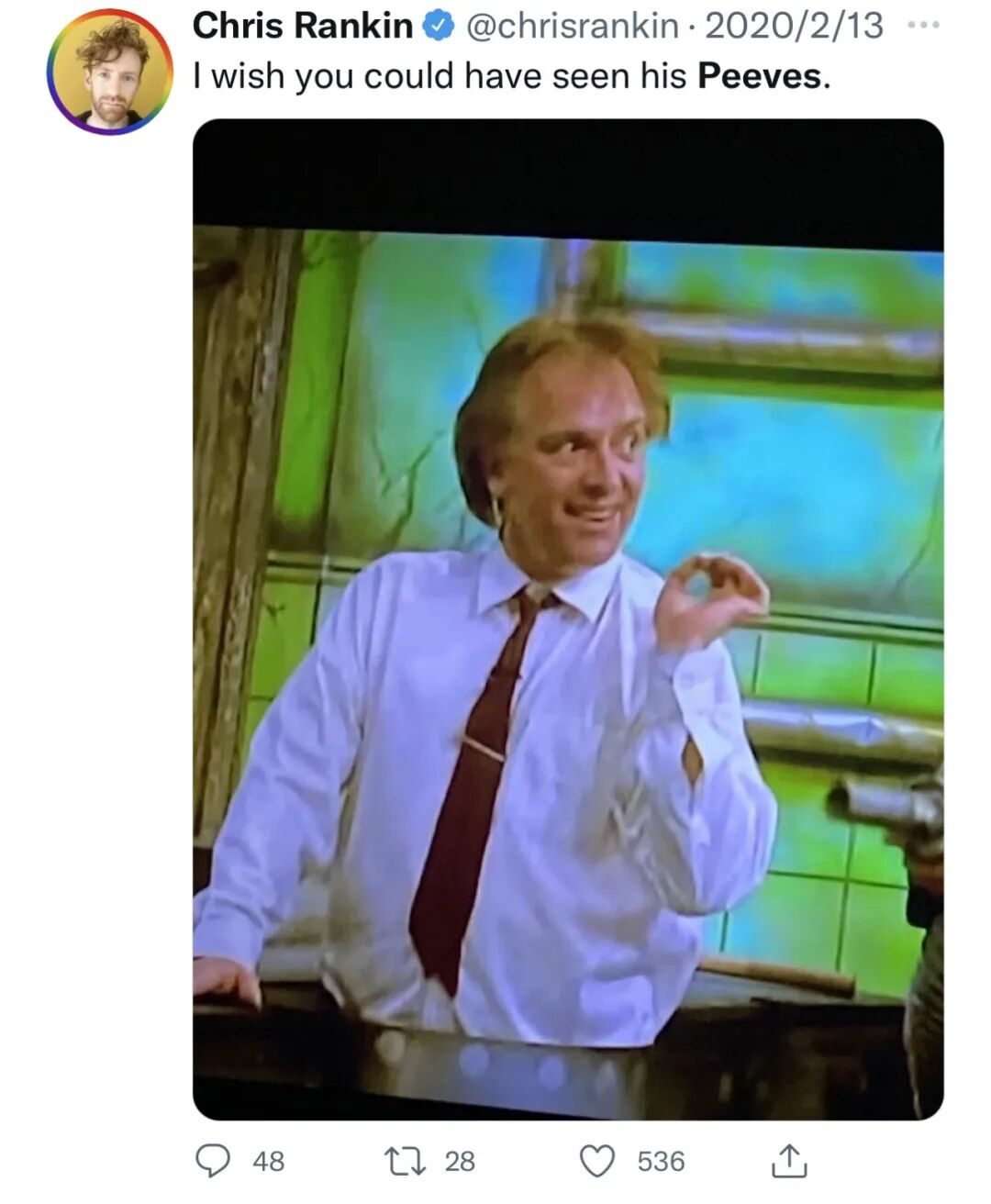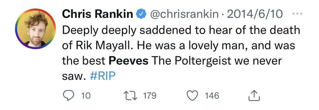 惊闻噩耗后,在《哈利·波特》系列电影中饰演“珀西·韦斯莱”一角的演员克里斯·兰金发推:“他是个可爱的人,是最好的皮皮鬼——我们未能有缘得见的那个恶作剧灵。”