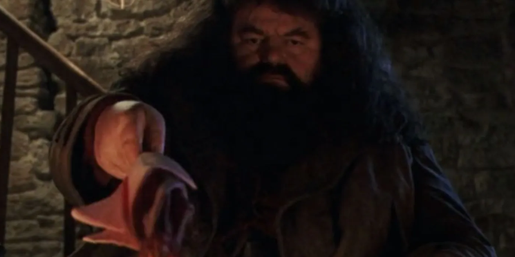 The owls typically seen in Harry Potter live in the Hogwarts owlery when they aren’t busy delivering messages. But Hagrid doesn’t seem to require this, opting instead to give his feathered friend a home inside his jacket.