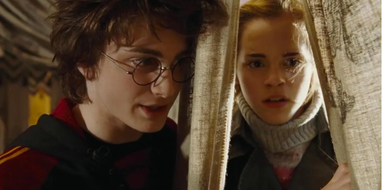 In the Triwizard Tournament, Harry was about to take on a ferocious dragon, and Hermione, who spoke to him anxiously outside the tent, couldn't resist giving him a reassuring hug.