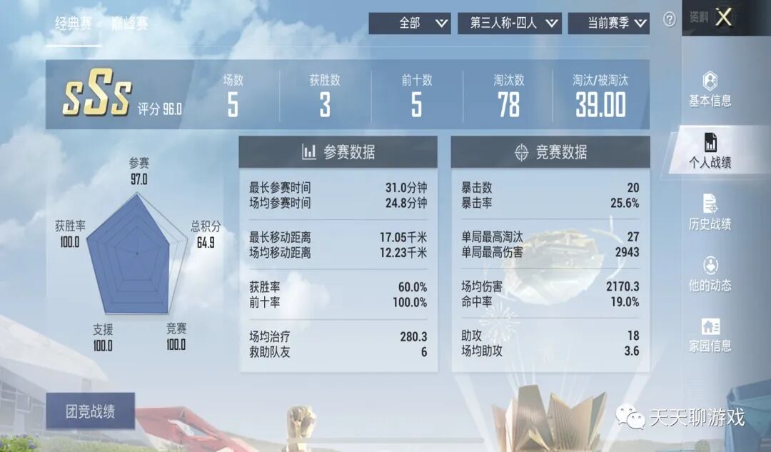 首先我们来看下“榜1战神”的战绩,从个人战绩来看的话,仅有5局四排,但是单局淘汰已经达到了27个,KD更是高达39~