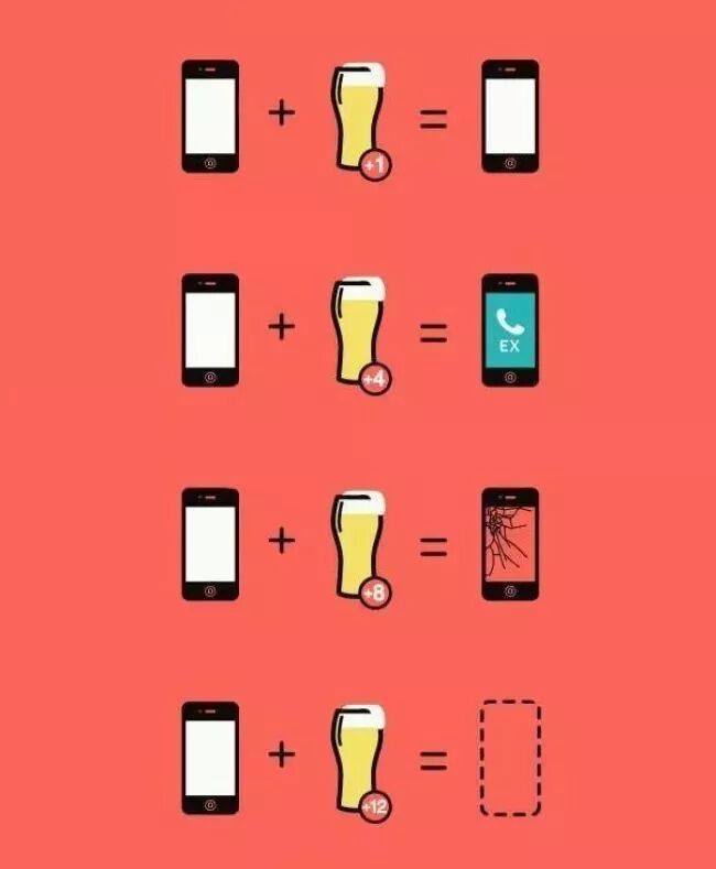 3、酒和手机在一起会产生什么变化?喝完一杯,手机还是手机;喝完四杯,就开始给前女友打电话了;当喝到第八杯酒,摔手机的现象产生了;十二杯酒下肚,手机早就不见了。