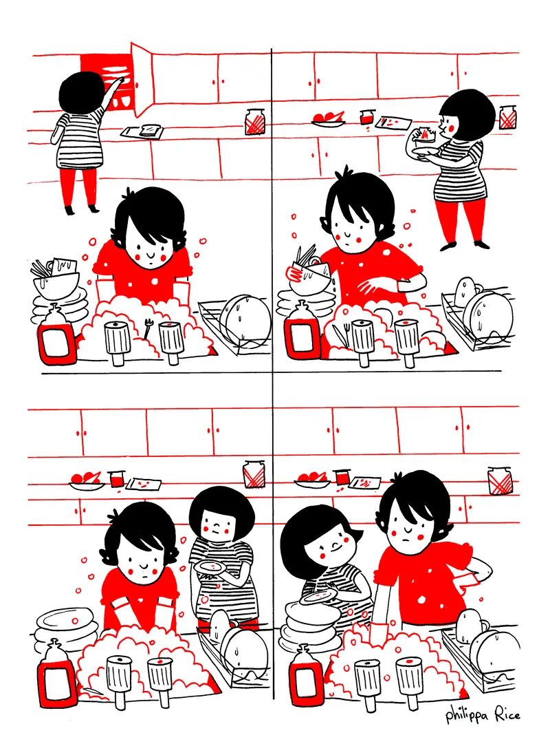 单从漫画来讲,菲丽帕·赖斯就以记录自己与爱人日常生活的漫画,受到不小的关注,她的漫画有着非常强的个人特色,红色和黑色是这位艺术家漫画的主打色,她以自己的生活为基调,描绘每一天发生的事情。