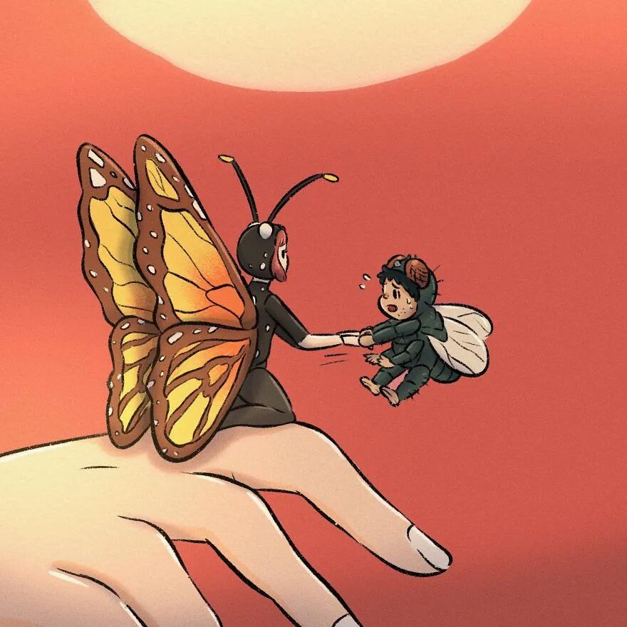 勇敢的苍蝇小伙,抓住蝴蝶小姐的手,救了她。