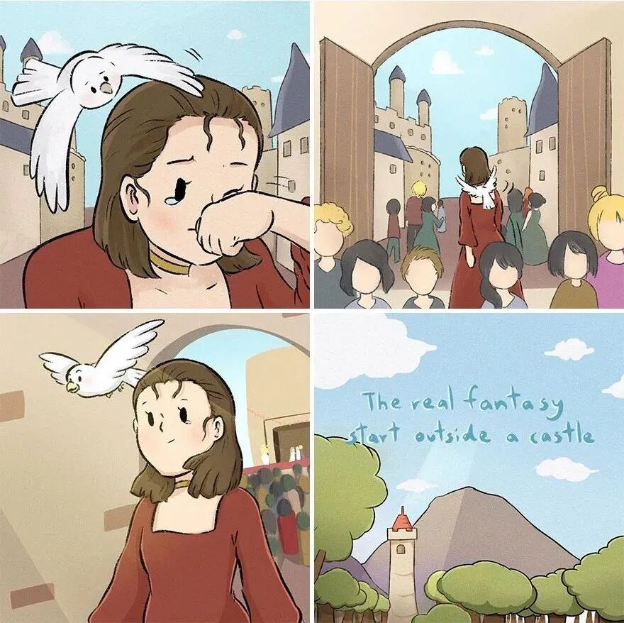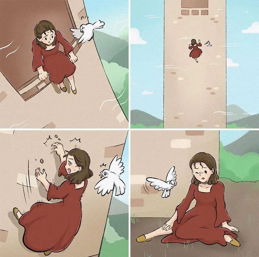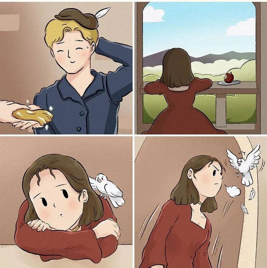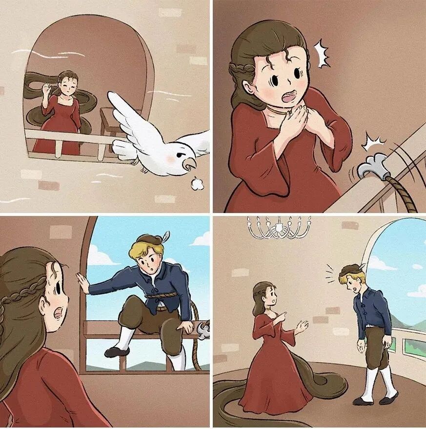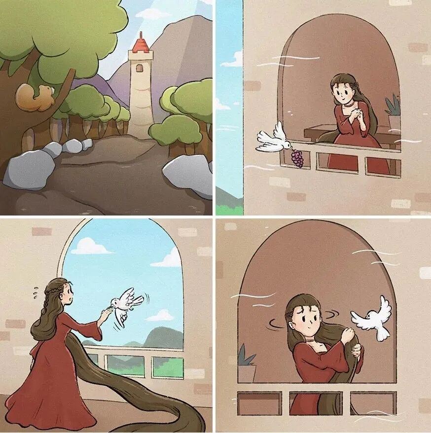 结束:擦干眼泪后,长发公主头也不回的走掉了,在这个漫画中,长发公主的长发就像是她的心,而远处的高塔,就像是她障碍,男孩骗走了她的心,却让她有勇气打破阻碍,去迎接新的生活。