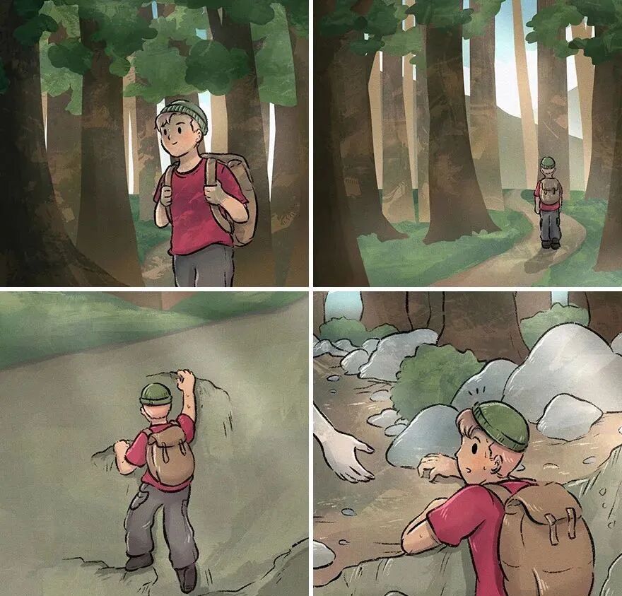 一个男孩去野外冒险,在爬坡的时候遇到了困难,突然伸出一只手来帮助他。
