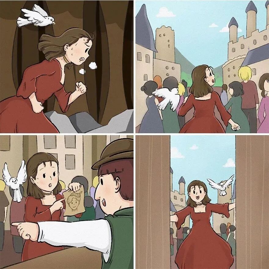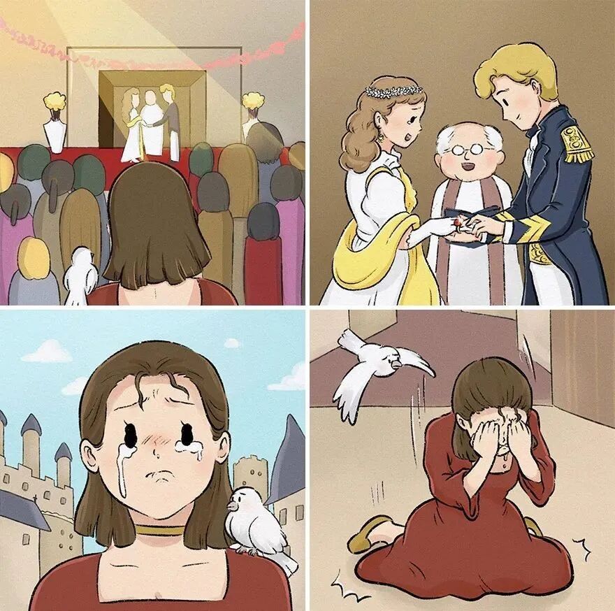 打开门的那一刻,她难过极了,因为长发公主看到那个男孩正在和其他的女人举行婚礼。