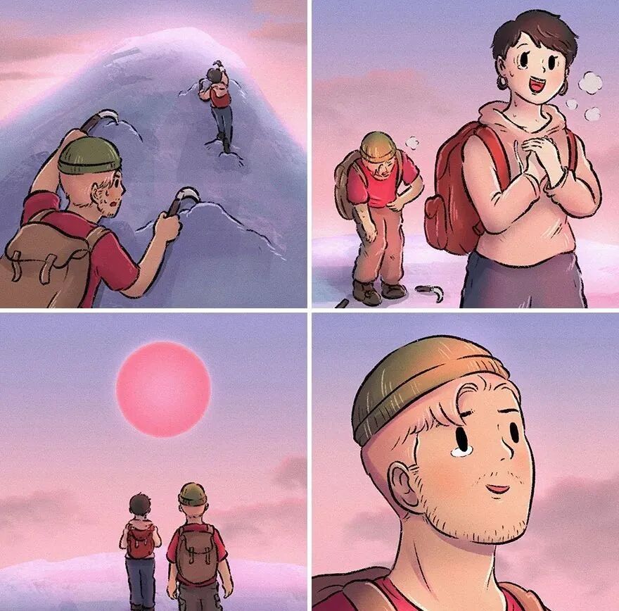 终于,他们历经千难万险,爬到了山顶,看到美丽的落日。