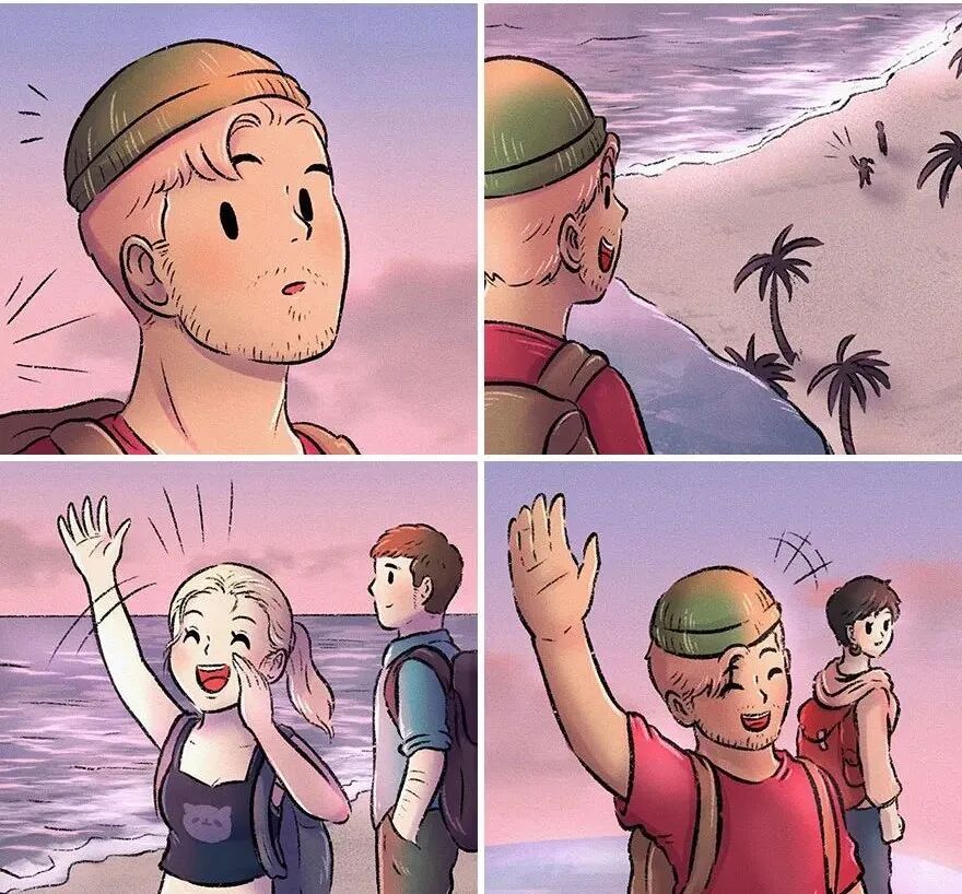 这时候,在山下的海滩上,一同旅行过的女孩正在和他打招呼,不过,她的旁边也有了一个男孩。