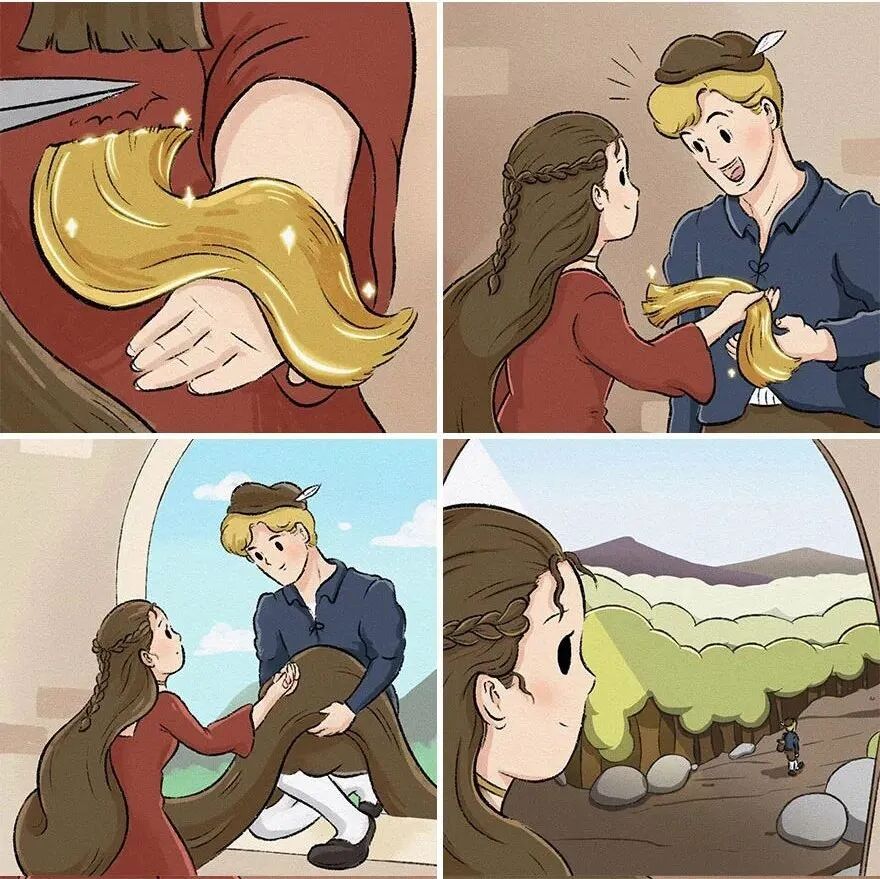 没过多久,那个男孩果然又来找长发公主,不过,这次是因为没有钱了,长发公主又将她的头发剪下来,送给了这个男孩。