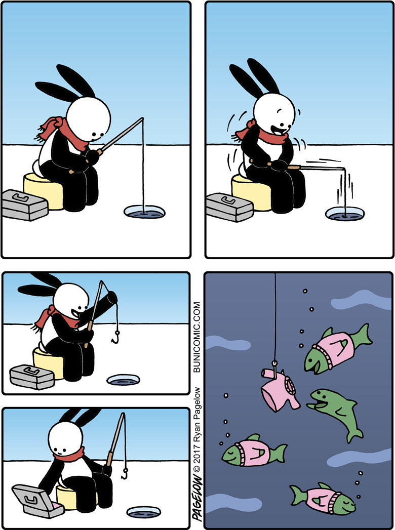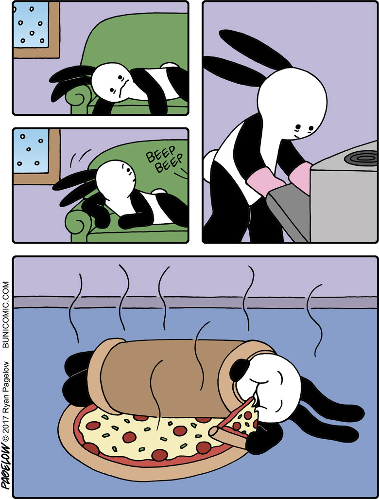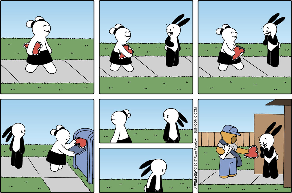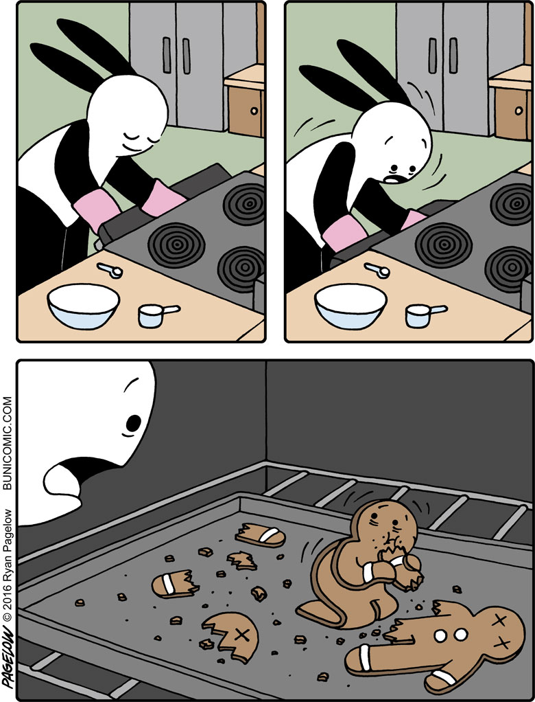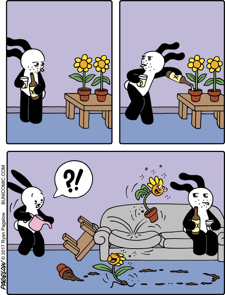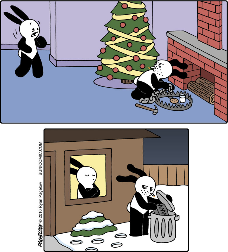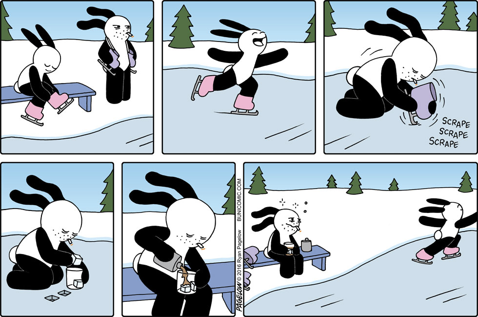 大多数漫画家都有着可观的作品数量以及丰富的主题内容,但瑞恩与他们不同,在长达10多年的时间里,他的漫画作品中的主角,只有一只兔子,却不是以连续剧情的方式呈现在我们眼前,这些漫画故事大都是由1到7幅不等的组合画面组成,每一个故事都可以单独拿来观看,从创作之初到今天,这位漫画家以这个兔子为主角创作了成百上千幅有趣的漫画作品。