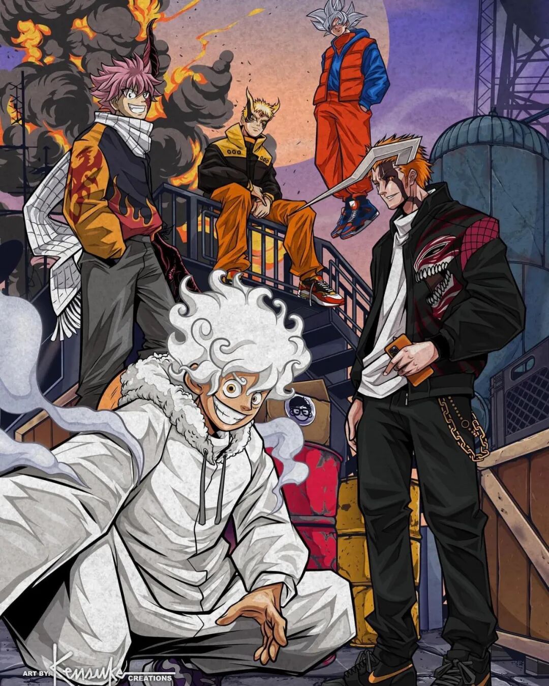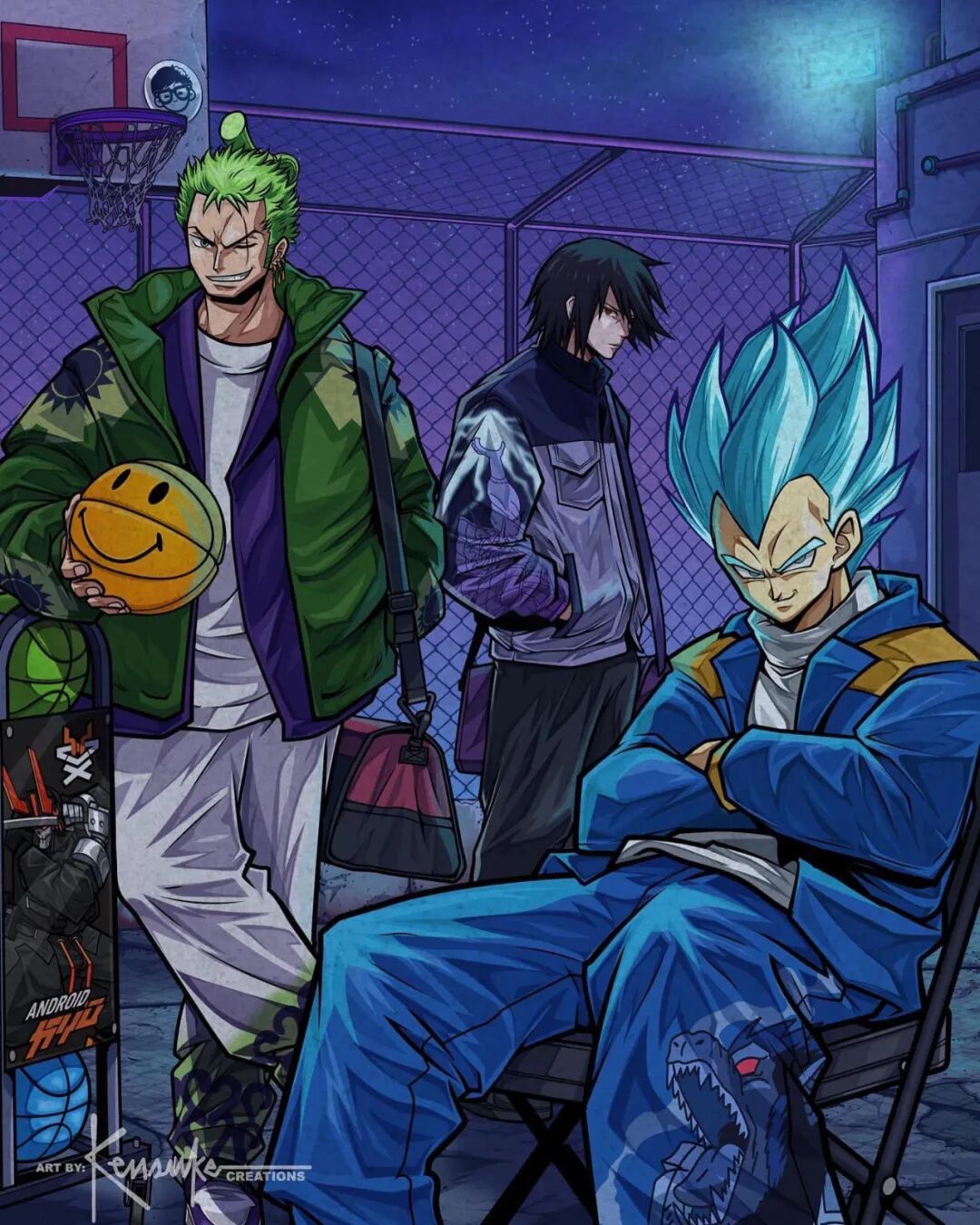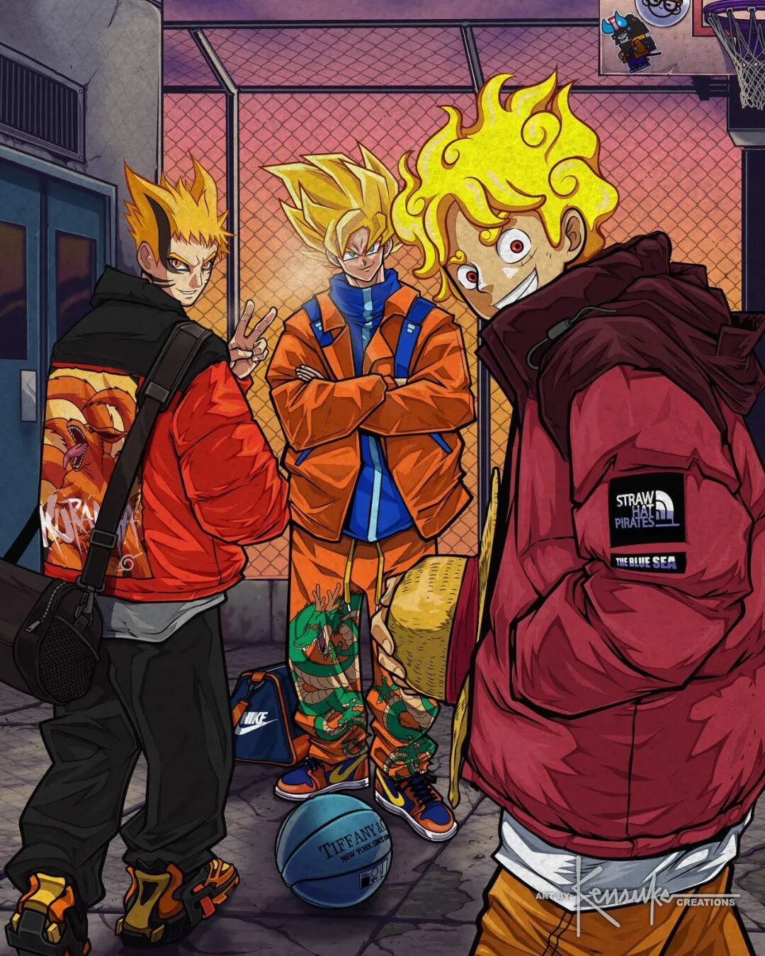 肯·亨斯利和我们很多人一样,也是看着这些动漫作品长大的,在成为插画家后,他也不断寻找绘画题材,最终将目标瞄准了这些动漫角色,这位插画家不仅将这些动漫角色变成了颇具“嘻哈”风格的现代人,还绘制了许多让人感觉兴奋的联动作品,像是《七龙珠》中的孙悟空、《火影忍者》中的鸣人、与《海贼王》中的路飞,这三部经典动漫主角以它们的最强状态出现在一张插图上,光是看到就让人感觉热血沸腾。