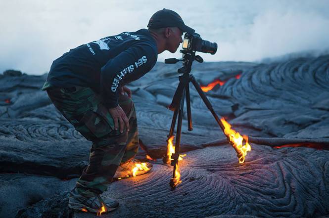 这位摄影师名叫Kawika Singson,他在拍摄火山的时候三角架和鞋子突然着火,但仍在继续拍摄,他曾说过:“为拍到最好的照片,我可以钻到地球中心去”。
