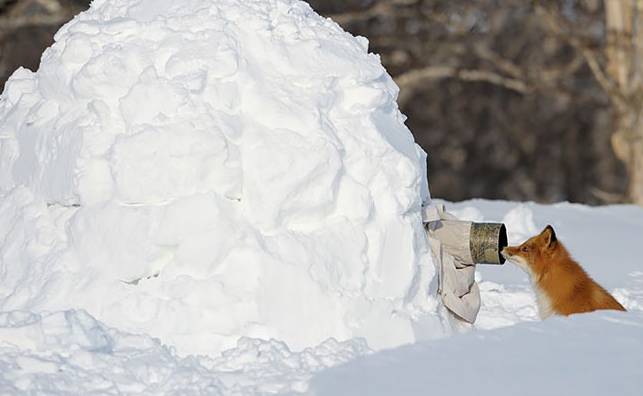 野兽动物摄影师,为了能近距离拍摄自然状态下动物的照片,不惜用寒冷的冰雪将自己伪装起来。