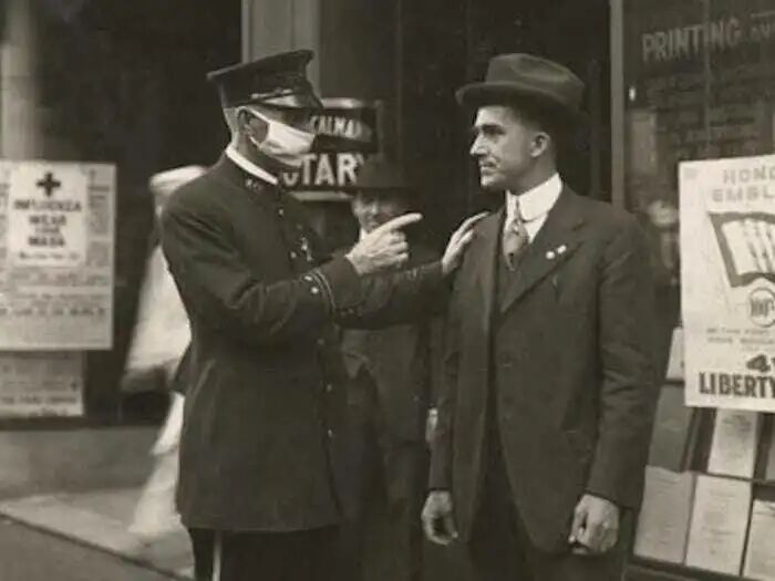 1918年,被称为“西班牙大流感”导致2500万~1亿人死亡,照片显示的就是当时一名美国警察教育一名未佩戴口罩的男人。